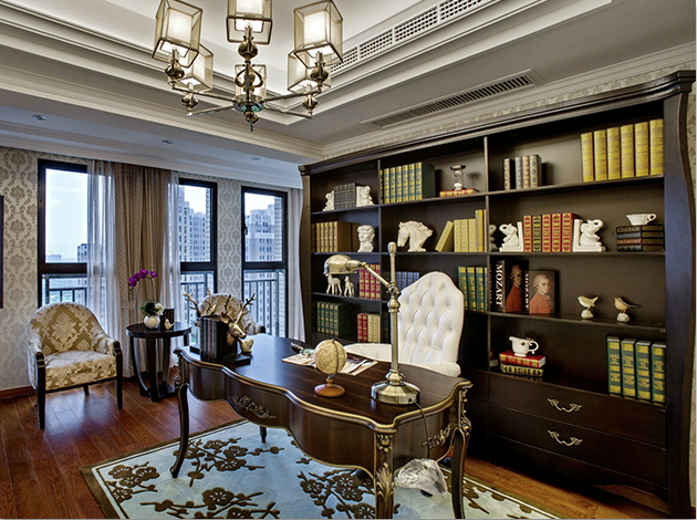 男人置身安靜的書房更顯冷靜,在高效率辦公活讀書的同時透露出濃濃的生活氣息。沿墻以整租書柜為背景,搭配別致寫字臺,空間更顯靈動。