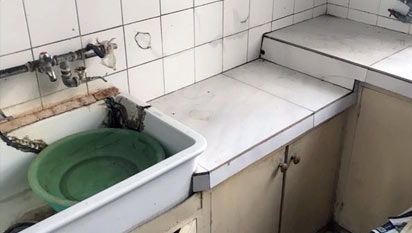 地面:瓷磚掉瓷,空鼓,不平整,瓷磚規(guī)格偏小,勾縫為老式黑色水泥勾縫,整體效果較差