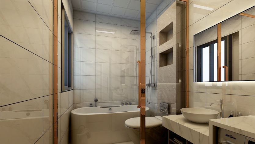 將馬桶改造為墻排馬桶,挪動下水位置,洗手池空間預(yù)留尺寸1200mm,淋浴空間可做隔斷分離,放置浴缸