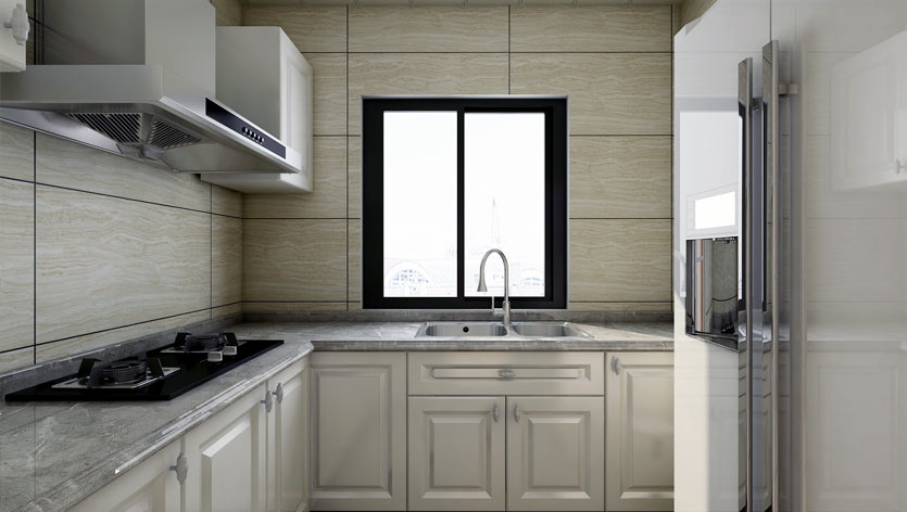 衛(wèi)生間和餐廳之間有一面的磚砌墻體,老房子的墻比較厚,所以把這面墻拆除掉,餐廳區(qū)得到了一面凹陷墻體用于鑲嵌雙開門冰箱