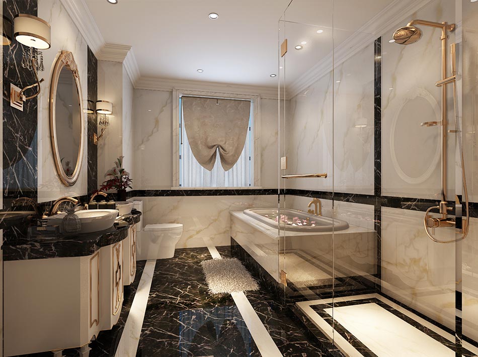 將馬桶改造為墻排馬桶,挪動下水位置,洗手池空間預(yù)留尺寸1200mm,淋浴空間可做隔斷分離,放置浴缸